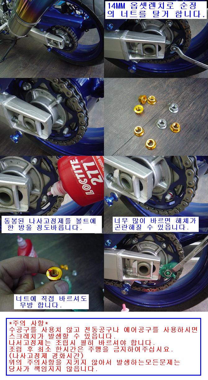 제품 포장에는 henkel loctite 社의 나사고정제 277이 첨부되어 있읍니다.(최초 조립 시나 탈착 시 나사고정제를 꼭 바르고 1시간 이상 경화 시킨 후 주행 하도록 하십시요.